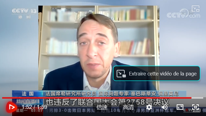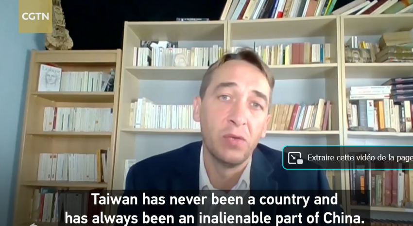Août 2022 : Passage dans le journal de CCTV en Chine et sur CGTN English à propos du voyage de Nancy Pelosi à Taïwan. En chinois en cliquant sur l'image de gauche et en français sous titré anglais l'image de droite.